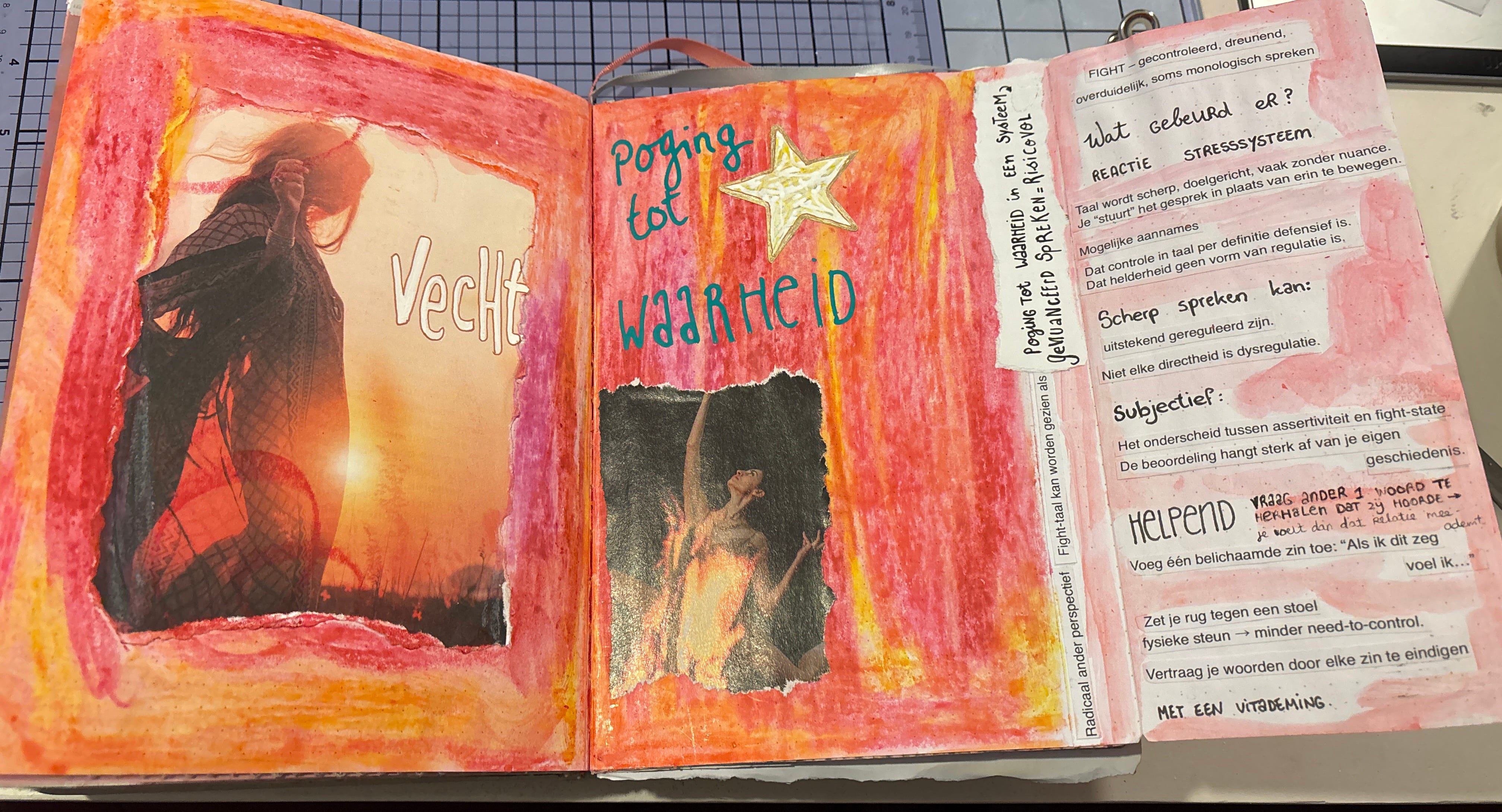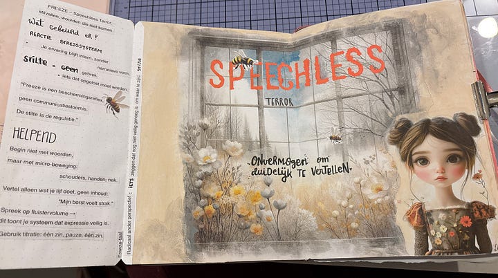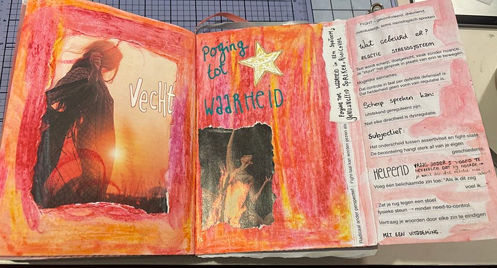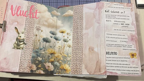 Zelf houd ik een art journal bij om ervaringen te verwerken, te ordenen en tot rust te komen. Soms is het moeilijk om gevoelens of gebeurtenissen in woorden te vatten. Beelden, kleuren, vormen en woorden helpen dan om uit te drukken wat er vanbinnen leeft. Een art journal is een veilige plek waar alles er mag zijn, zonder oordeel.