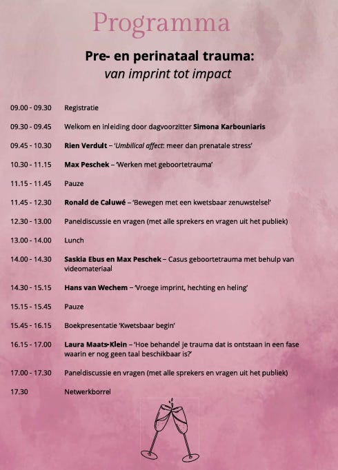 Wil je Ronald en mijzelf zien optreden? Maar vooral: ben je geïnteresseerd als professional of ervaringsdeskundige in de gevolgen van trauma in de tijd in de baarmoeder, rond de geboorte of de uren tot maanden daarna, kijk dan eens of dit symposium op 11 november 2026 iets voor je kan zijn!